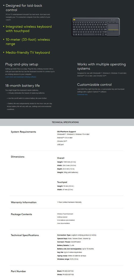 Logitech K400 PLUS Touch Wireless keyboard - Black (920-007165)